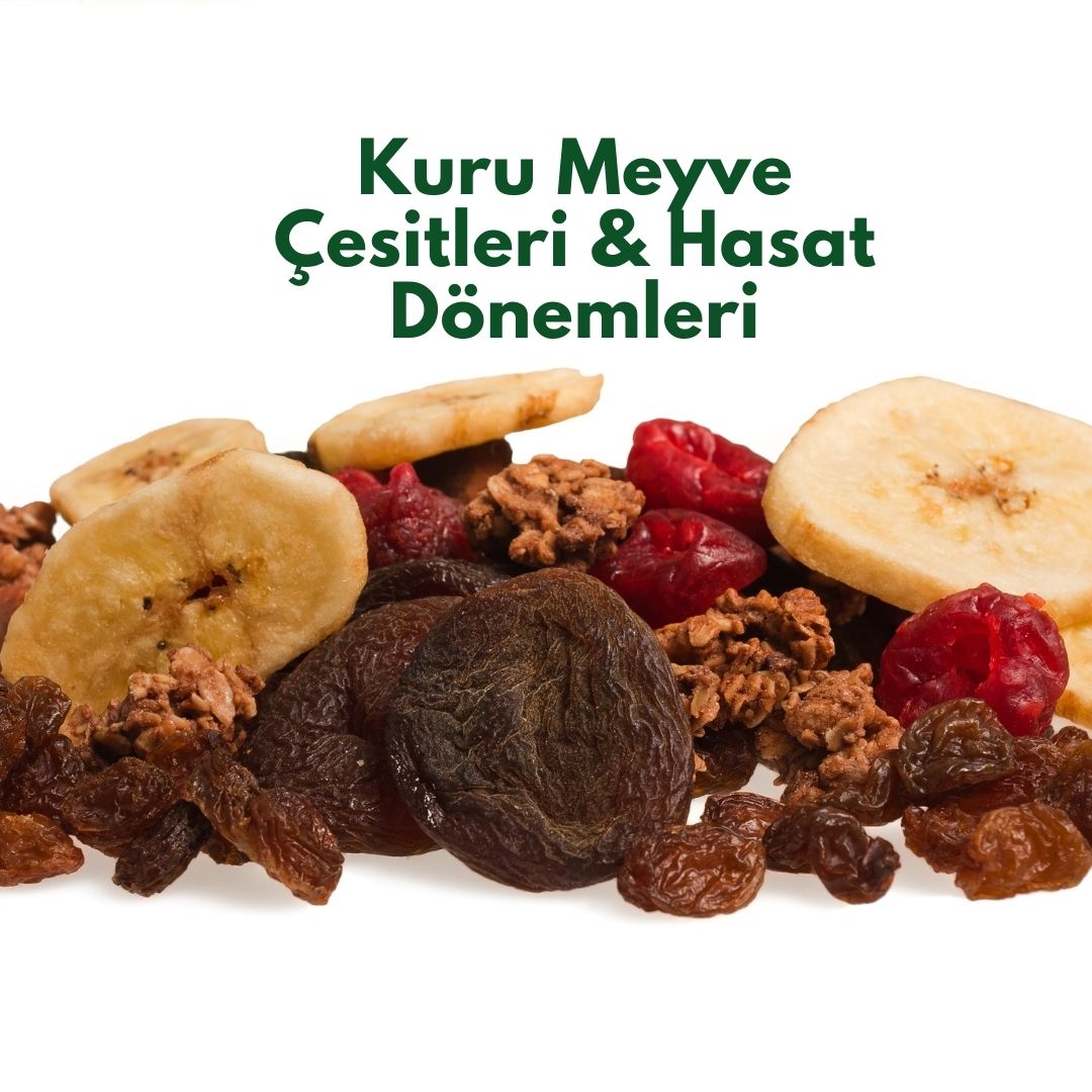 Kuru meyveler, meyvelerin suyunun alınması veya doğal olarak kurutulmasıyla elde edilen besleyici ve lezzetli atıştırmalıklardır. İşte yaygın olarak bilinen kuru meyve çeşitleri ve hasat dönemleri: